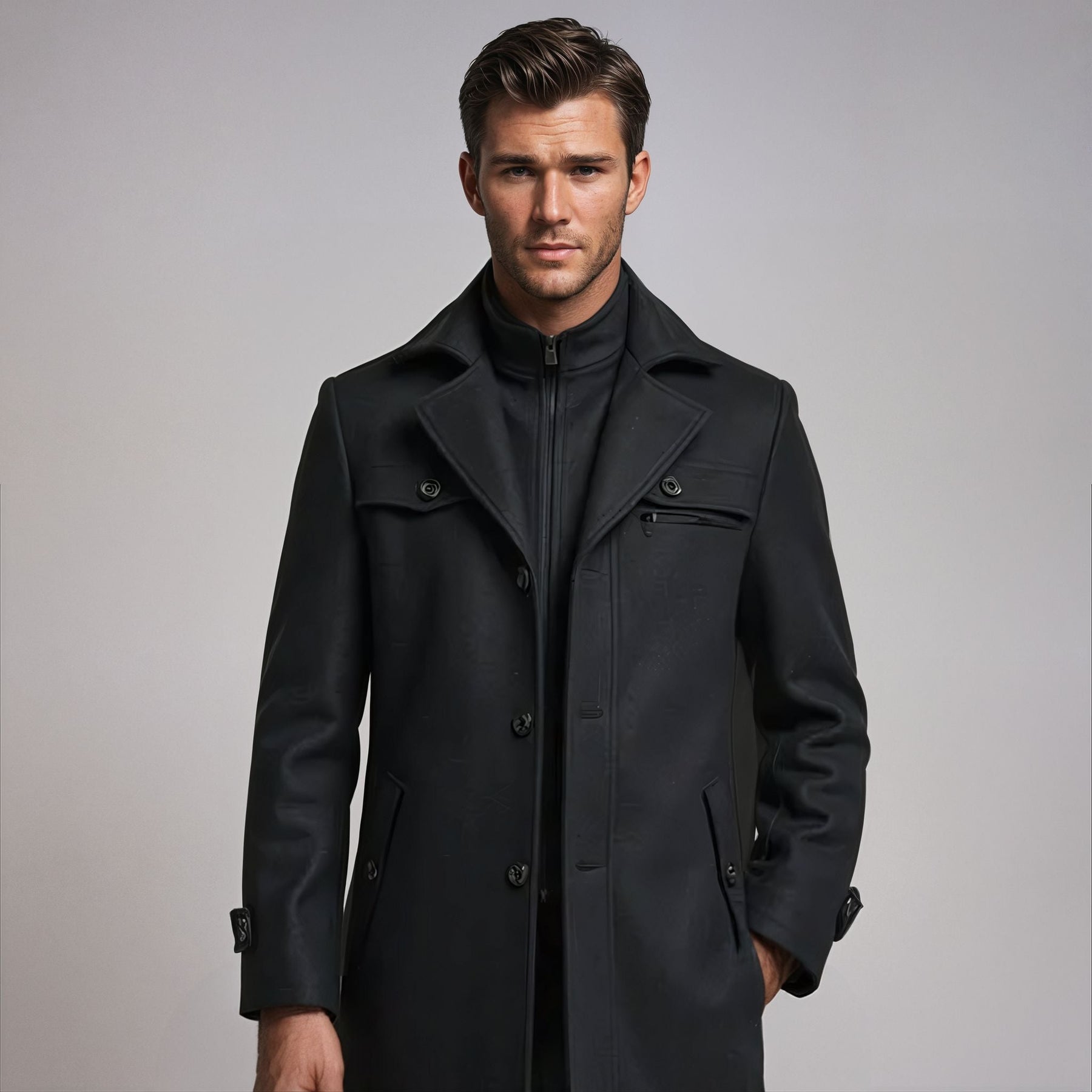 This sophisticated black trench coat combines timeless elegance with modern tailoring, making it a standout addition to any wardrobe. Perfect for formal settings or elevating everyday attire, it balances practicality and refined style.
